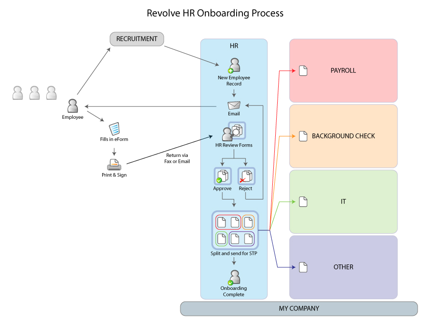 A large Australian financial institution regularly provided induction packs and forms for new employees, temporary staff and contractors and for transferring staff internally. They had 10-20 separate forms that had to be completed, were couriered and then scanned back in for record keeping.